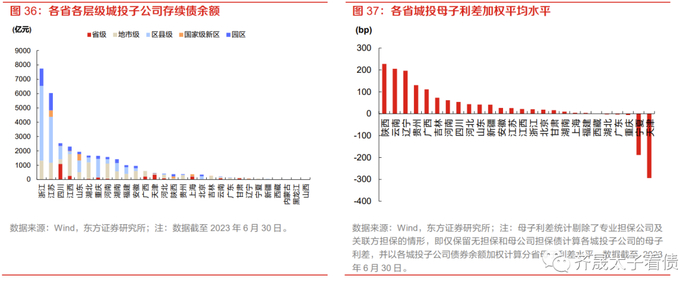 最终看各省母子利差统计情况,陕西、云南和辽宁母子利差大约在200bp左右,为全国最高的三省,其中陕西主要受曲文投主导,曲文投之于曲江文控利差差距明显且发债规模也较大,最终全省加权平均母子利差高达227bp,同理,昆明主要受昆明交产股份-昆明交投影响,而辽宁则统计到大连德泰控股-金普新区产控母子利差较大;相反,天津和宁夏母子利差显著为负,其中天津主要受津城建下属天津轨交集团、地铁集团和铁投集团利差相对偏低影响,宁夏则是银川城投估值显著低于母公司银川通联资本。