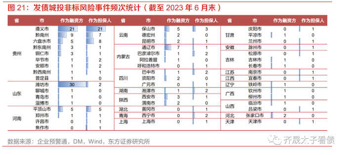截至目前,我们统计到的发债城投非标风险事件累计有199起。贵州省长期为高发地区,山东、河南、云南等地也陆续出现多起,其他区域普遍涉及1~2起或尚未出现过非标风险。