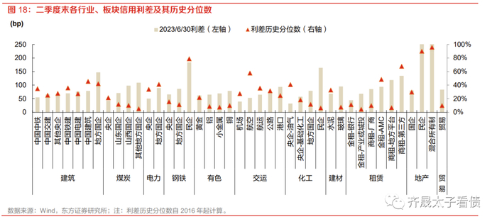 从利差绝对水平看,目前估值偏低的板块有煤炭、电力、化工等行业中的央企以及银行系金租;利差偏高的板块主要是建筑地方国企、钢铁和化工民企、地方平台系和第三方系商租以及民营、混合所有制地产。从历史分位数看,当前利差历史分位数偏高的行业主要为建筑和地产,交运及租赁行业中个别板块主体利差压降也相对偏慢。