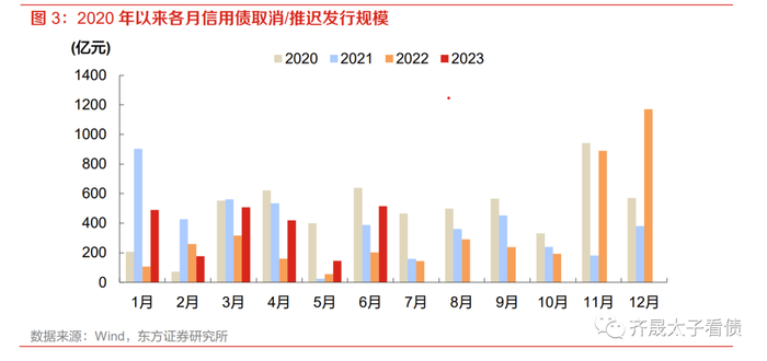 二季度信用债取消或推迟发行规模环比稍降,处于往年同期平均水平。二季度信用债一级融资环境总体平稳,4~6月依次取消或推迟发行420亿元、145亿元和515亿元,合计环比一季度减少8%至1079亿元,属往年同期平均水平。