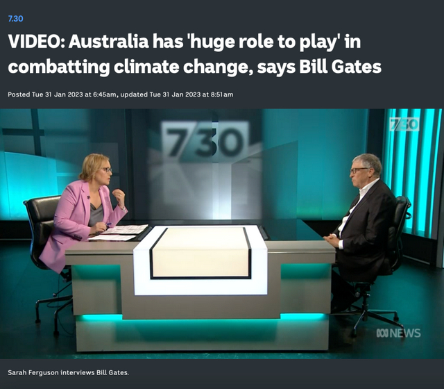 网传视频右上角有一水印,疑似澳大利亚广播公司ABC News时政新闻栏目《7.30》的标志。在ABC News的网站上搜索关键词“比尔·盖茨”,可以发现,2023年1月,盖茨曾受邀参加主持人莎拉·弗格森(Sarah Ferguson)的现场专访。