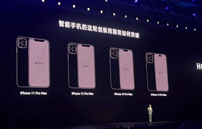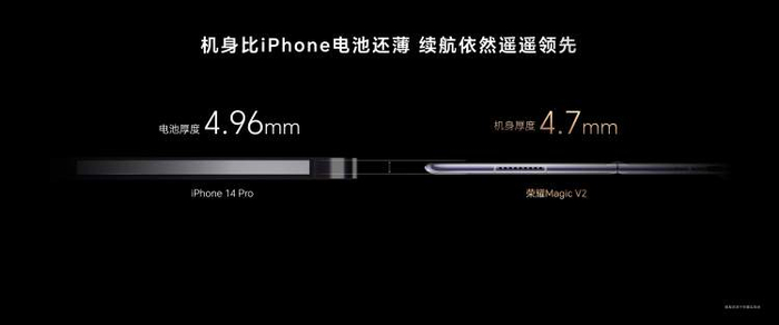 每次发布会上,赵明都会把苹果产品作为对比的标杆,这次荣耀Magic V2发布,iPhone 14pro多次出现在发布会大屏幕上,电池厚度、续航时间、通信体验、隐私通话等,Magic V2都胜出一筹。