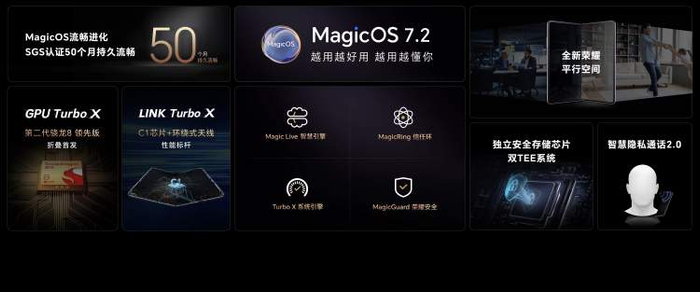 此次发布的荣耀Magic V2系列搭载MagicOS 7.2系统,开启平行空间,仿佛将第二台手机装入折叠屏。用户可以将工作资料、保密文档放置在工作空间,而家庭合照、证件照片等放置在生活空间,让数据实现安全隔离。
