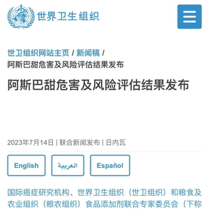 7月14日,世卫组织官网发布消息,国际癌症研究机构(IARC)、世界卫生组织(WHO)和粮食及农业组织食品添加剂联合专家委员会(JECFA)发布了阿斯巴甜对健康影响的评估报告,国际癌症研究机构援引对人类致癌性的“有限证据”,将阿斯巴甜归为可能对人类致癌之列(国际癌症研究机构第2B组),联合专家委员会重申其每日允许摄入量为每公斤体重40毫克。
