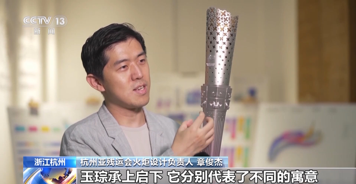 杭州亚残运会火炬设计负责人 章俊杰:玉琮承上启下,它分别代表了不同的寓意。承上我们用点点的星光汇聚成桂花的桂冠,可以看到我们的星光越来越稠密,最后形成蓬勃向上,向上迸发、进发这样的一个意向。我们希望体现整个火炬设计积极向上的那种力量感。