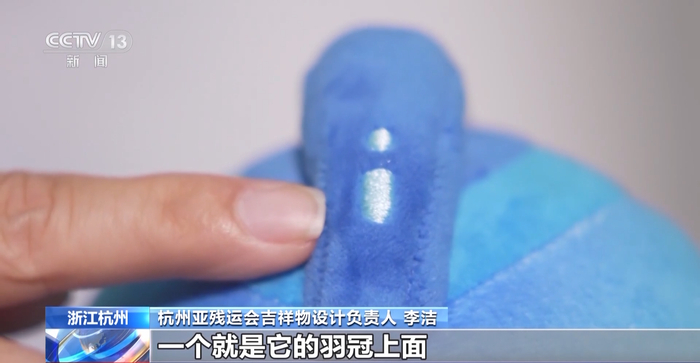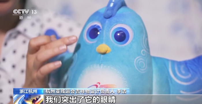 杭州亚残运会吉祥物设计负责人 李洁:在“飞飞”的身体上其实有两个比较特殊的元素,一个就是它的羽冠上面有一个字母的“i”,然后包括胸口其实有45个蓝点,这两个东西其实都是杭州的一个智慧科技的象征。它们在高兴的时候会发出一些蓝色的光芒,来象征我们运动员欢聚一堂的喜悦心情。