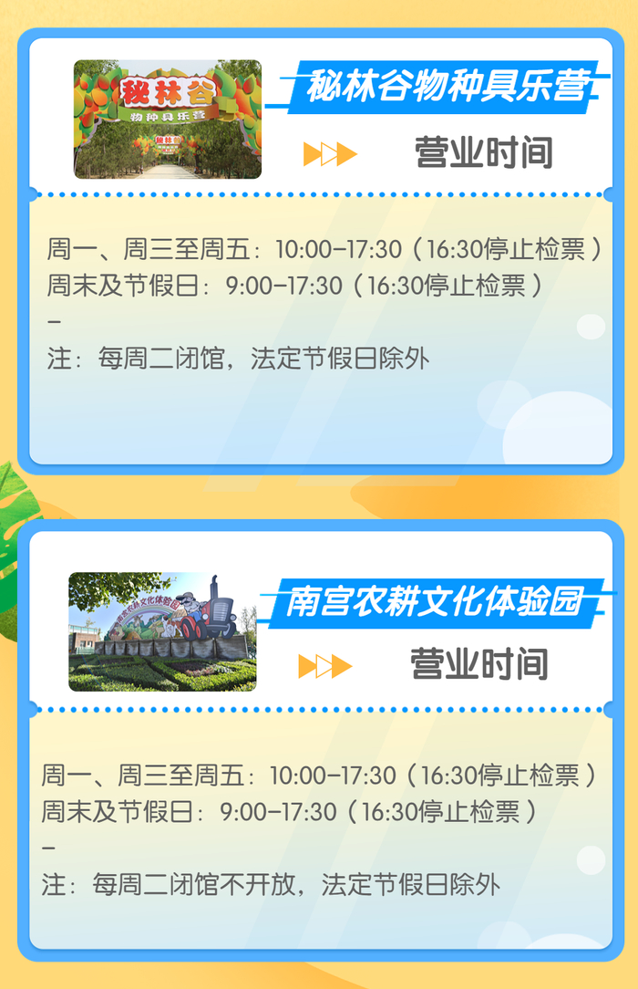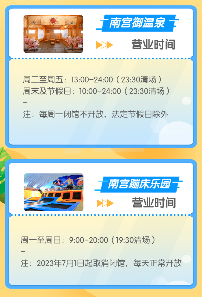 南宫温泉水世界、南宫民族温泉养生园、南宫五洲植物乐园均已开放夜场,其中南宫温泉水世界和南宫民族温泉养生园的夜场时间为17:30至21:00,20:30清场,南宫五洲植物乐园的夜场时间为每周五、六17:30至21:30,20:30停止检票。