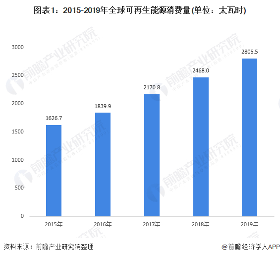 能源资源和环境问题日益突出,加快开发利用可再生能源已成为全球应对日益严峻的能源环境问题的必由之路。2019年,可再生能源(包括生物燃料)在能源消费方面出现了创纪录的增长,达到2805.5太瓦时,3.2千兆焦耳,是2019年来能源方面的最大增量,占全球一次能源增长的40%以上;可再生能源的发电量占比达10.4%,历史上首次超过核电。