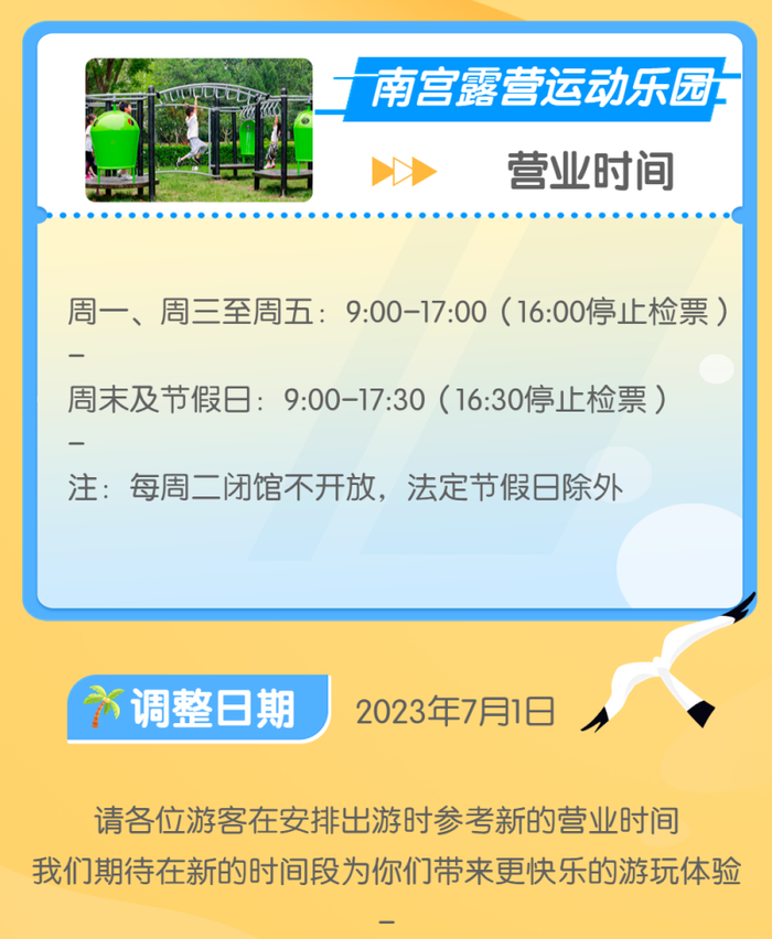2023年7月5日至2023年10月9日期间,国家体育场(鸟巢)全景游延长夜间参观开放时间,营业时间由原来的每日10:00-21:00(20:00停止检票)调整为每日10:00至22:00(21:00停止检票)。同时,鸟巢夜间景观照明时间同步延长,调整为19:40-22:30。