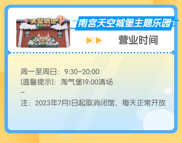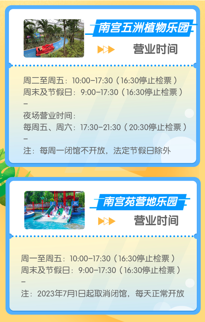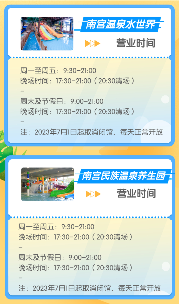 南宫温泉水世界、南宫民族温泉养生园、南宫五洲植物乐园均已开放夜场,其中南宫温泉水世界和南宫民族温泉养生园的夜场时间为17:30至21:00,20:30清场,南宫五洲植物乐园的夜场时间为每周五、六17:30至21:30,20:30停止检票。