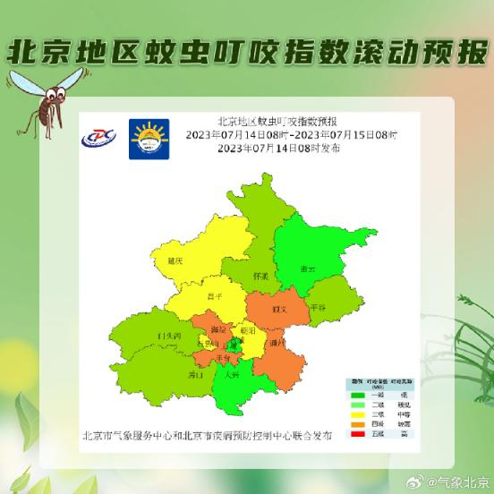 7月14日北京蚊虫叮咬指数为三级,室外久留可穿长袖长裤