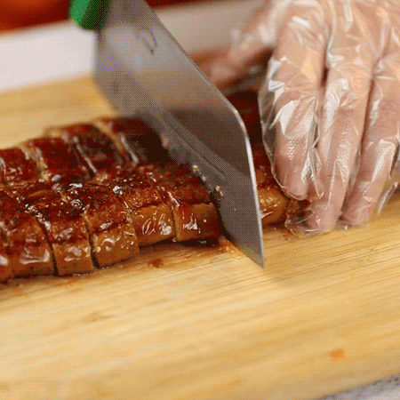 看这鳗鱼的切面,肉质实在是肥厚!小编用筷子夹了一下,能感受到到它的饱满、有弹性、柔嫩却不松散,皮与肉之间还有一层肥美的胶原蛋白。