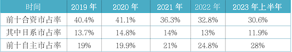零售销量排行榜中合资和自主品牌的市占率变迁也同步反映了上述现象。根据第一财经记者统计,销量排行榜TOP10中合资企业市占率从2021年的41.1%一路下滑至2023年上半年的30.6%;而反观TOP10中自主品牌市占率则是从19.9%持续提升到了28%。