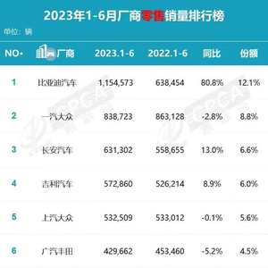 随着7月的到来,车企“半年考”成绩单出炉。日前,乘联会发布了2023年上半年厂商零售销量TOP10排行榜。