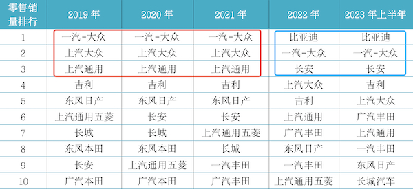 从2019年以来TOP10厂商零售销量排行榜中的企业来看,主要的变动在榜单的“金字塔顶端”,即排名前五甚至前三的企业。在2022年以前,车市零售销量前三的位置长期被一汽-大众、上汽大众、上汽通用三家合资公司霸占,而到了2022年,比亚迪和长安汽车齐齐挺进前三,而曾经的“合资三剑客”如今只剩下一汽-大众还在。