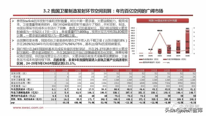 参照Starlink的年发射节奏和发射数量,对比中美一箭多星、火箭运载能力、载荷成 本、卫星重量等案例资料,我们对GW星座发射节奏进行了预估,并对发射、制造、 地面站等环节的成本分别进行了测算。参照上文的星座对比,我们假设我国火箭发 射峰值为一年52次(7天一次),单星重量约为800kg,按照长征五号有效LEO载荷 计算,一箭多星的峰值预计为一箭24颗卫星。 由测算结果来看,我国低轨卫星星座有望在27年前入轨千颗卫星(达到总数的8%), 并在2029/32/34年内完成总数的27%/56%/75%,基本达成ITU的里程碑要求。 我们预计在24年我国将基本完成实验星的发射测试,并在25-27年逐步提升火箭发 射次数和一箭多星运载能力,并在2028年后开始以测算峰值常态化发射。随着规模 化效应显现、供应链民营企业占比提升、火箭多级回收技术成熟等因素影响,卫星 各环节成本有望持续下降。总的来看,未来5年我国有望进入低轨卫星产业高速增长 区间,24-28年5年CAGR有望达到121.1%。