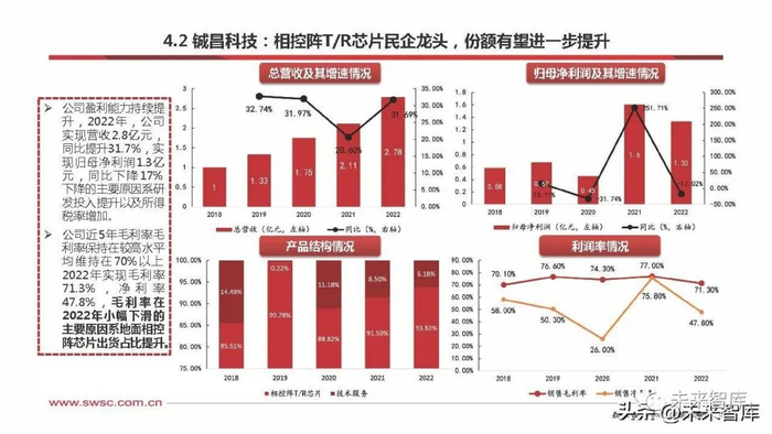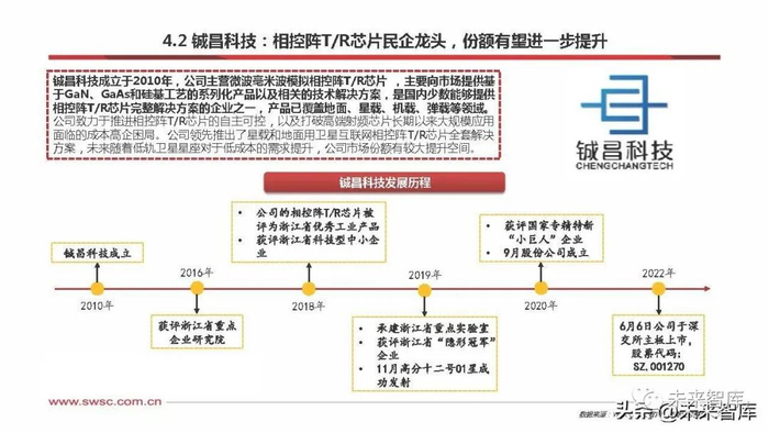 铖昌科技成立于2010年,公司主营微波毫米波模拟相控阵T/R芯片 ,主要向市场提供基 于GaN、GaAs和硅基工艺的系列化产品以及相关的技术解决方案,是国内少数能够提供 相控阵T/R芯片完整解决方案的企业之一,产品已覆盖地面、星载、机载、弹载等领域。 公司致力于推进相控阵T/R芯片的自主可控,以及打破高端射频芯片长期以来大规模应用 面临的成本高企困局。公司领先推出了星载和地面用卫星互联网相控阵T/R芯片全套解决 方案,未来随着低轨卫星星座对于低成本的需求提升,公司市场份额有较大提升空间。