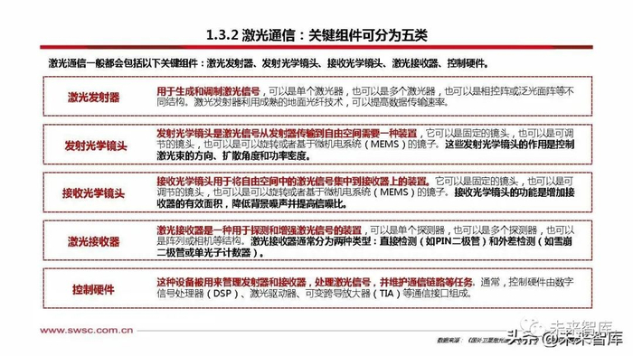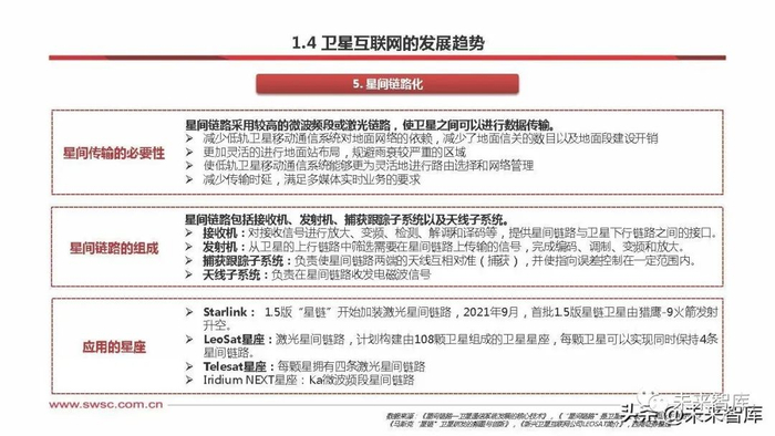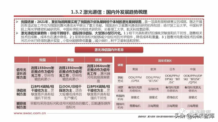 激光通信技术日益成熟,在星间通信中的使用逐步增多。激光通信受益于地面的光纤通信对产业链的催化,其优势为传输速率高、 无频段限制,且对其他任何星间通信不会造成干扰,但其对链路的建立过程有非常高的要求,一般只能一对一的传输。
