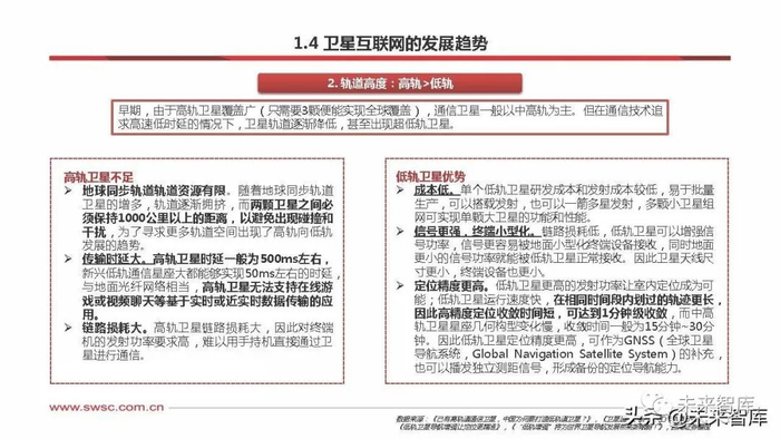 从卫星轨道高度来说有高轨同步卫星、中轨卫星、低轨卫星等。高轨卫星和低轨卫星存在互补关系和竞争关系。 互补关系:地球静止轨道卫星和地球自转同步,只对某一固定区域服务,低轨卫星对地面的覆盖是移动的,是高轨卫星的补充。 竞争关系:低轨卫星传输时间低、路径损耗少、卫星终端体积小、成本低、系统容量大,在卫星通信方面具有竞争优势。