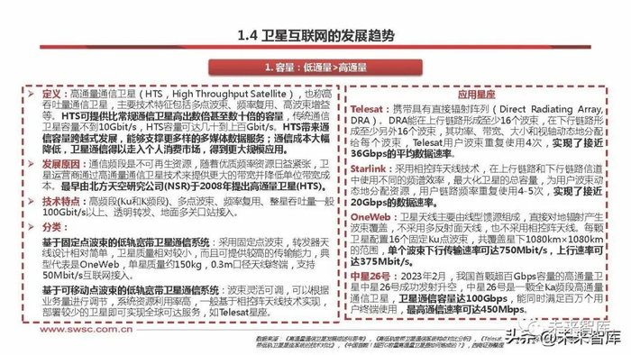 定义:高通量通信卫星(HTS,High Throughput Satellite),也称高 吞吐量通信卫星,主要技术特征包括多点波束、频率复用、高波束增益 等。HTS可提供比常规通信卫星高出数倍甚至数十倍的容量,传统通信 卫星容量不到10Gbit/s,HTS容量可达几十到上百Gbit/s。HTS带来通 信容量跨越式发展,能够支撑更多样的多媒体数据服务;通信成本大幅 降低,卫星通信得以走入个人消费市场,得到更大规模应用。