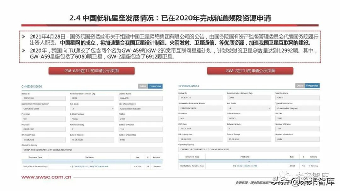 2021年4月28日,国务院国资委发布关于组建中国卫星网络集团有限公司的公告,由国务院国有资产监督管理委员会代表国务院履行 出资人职责。中国星网的成立,将加速整合我国卫星设计制造、火箭发射、卫星通信、等优质资源,加速我国卫星互联网的建设。 2020年,我国向ITU递交了包含两个名为GW-A59和GW-2的宽带互联网星座计划,计划发射的卫星总数量达到12992颗。其中, GW-A59星座包括了6080颗卫星,GW-2星座包含了6912颗卫星。