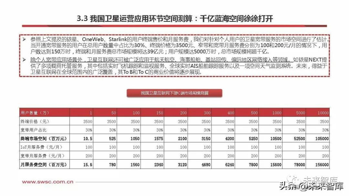 参照上文提及的铱星、OneWeb、Starlink的用户终端售价和月服务费,我们对针对个人用户的卫星宽带服务的市场空间进行了估计。 当开通宽带服务的用户在总用户数量中占比为30%、终端价格为3500元、窄带和宽带月服务费分别为100和200元/月的情况下,用 户数达到150万时,终端和月服务费总市场规模将达39亿元;用户规模达5000万时,总市场规模将超千亿。 除个人宽带应用场景外,卫星互联网还可被广泛应用于航天航空、海事船舶、基站回传、偏远地区网络接入等领域。如铱星NEXT提 供了多项载荷托管服务,其中包括实时飞机跟踪和监视服务、全球实时AIS船舶跟踪服务以及一项空间天气监测系统。未来,得益于 卫星互联网在全球范围内的广泛覆盖,其ToB和To C的商业价值将逐步展现。