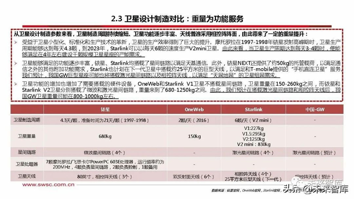 从卫星设计制造参数来看,卫星制造周期持续缩短、卫星功能逐步丰富、天线普遍采用相控阵阵面,由此带来了一定的重量提升: 受益于卫星小型化、标准化和生产技术的革新,卫星的生产效率得到了巨大的提升。摩托罗拉在1997-1998年铱星发射高峰期时,卫星生产 周期能够达到每天4.3颗,到2023年,Starlink可以以每天6颗的速度生产V2mini卫星。由此来看,当卫星生产周期达到每天3-4颗时,便能 够满足在4年左右建设千颗规模卫星星座的产能需求。 卫星能够满足的功能逐步丰富,铱星、Starlink均搭载了星间链路以满足天基通信。此外,铱星NEXT还提供了约50kg的托管载荷,以满足通 信之外的其他附加功能需求,Starlink也计划在下一代卫星中搭载约25平方米的巨型天线,以满足和T-mobile提供的“手机直连卫星”服务。 我们预计,我国GW巨型星座可能也将搭载激光星间链路以及相控阵天线,以满足“天网地网”的卫星组网需求。 卫星功能的增加也增加了需要搭载的硬件设备,OneWeb和Starlink V1卫星不搭载星间链路,卫星重量在150-260kg之间,而铱星和 Starlink V2卫星分别搭载了微波和激光星间链路,重量来到了680-1250kg之间。由此,我们预计在搭载激光星间链路和相控阵天线后,我 国GW卫星重量可能在800-1000kg左右。