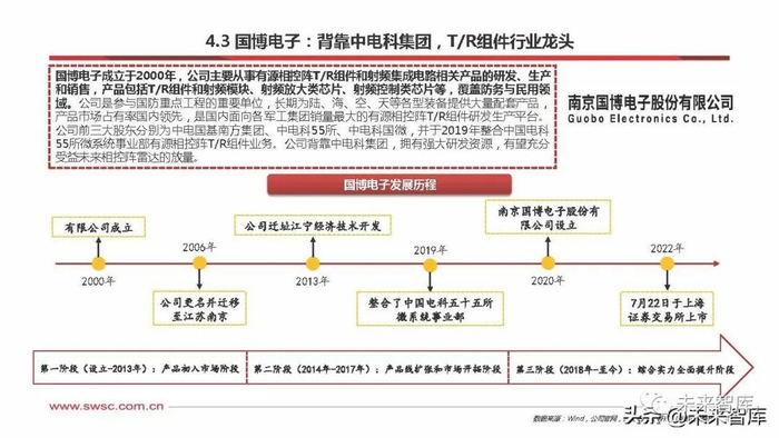 国博电子成立于2000年,公司主要从事有源相控阵T/R组件和射频集成电路相关产品的研发、生产 和销售,产品包括T/R组件和射频模块、射频放大类芯片、射频控制类芯片等,覆盖防务与民用领 域。公司是参与国防重点工程的重要单位,长期为陆、海、空、天等各型装备提供大量配套产品, 产品市场占有率国内领先,是国内面向各军工集团销量最大的有源相控阵T/R组件研发生产平台。 公司前三大股东分别为中电国基南方集团、中电科55所、中电科国微,并于2019年整合中国电科 55所微系统事业部有源相控阵T/R组件业务。公司背靠中电科集团,拥有强大研发资源,有望充分 受益未来相控阵雷达的放量。
