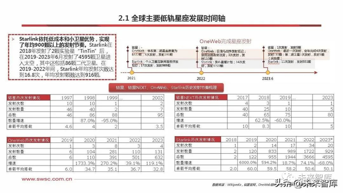 2000年左右低轨宽带卫星 星座进入高潮。1988年, 铱星星座计划在摩托罗拉的 一个实验室成立,2014年 OneWeb前身WorldVu卫 星公司在英国成立,2014 年Starlink商标注册。在发射实验星后,铱星和 OneWeb星座均在5年内完 成了发射。铱星在1997年 完成了实验星座的发射,并 在1997-1999的3年时间内 完成了卫星星座的发射建立 (铱星NEXT在2017-2019 的3年时间完成发射建立)。 OneWeb则在2019年发射 实验星后,在2020-2023的 3年时间内,完成了632颗 卫星的发射组网,并开启商 业服务。
