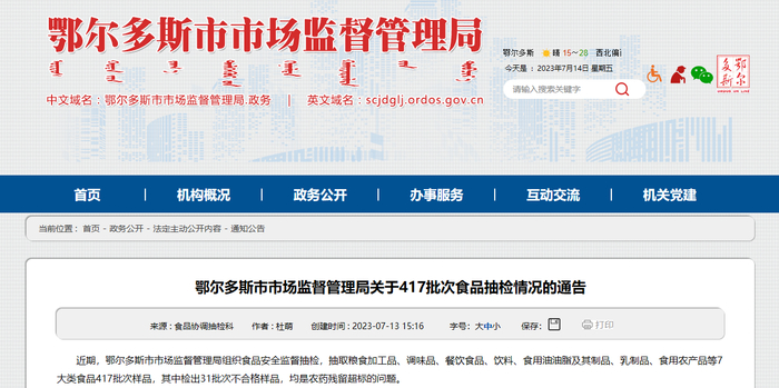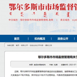 内蒙古鄂尔多斯市市场监督管理局公布417批次食品抽检情况