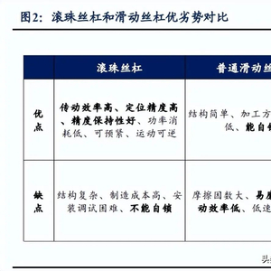 相较普通滑动丝杠,滚珠丝杠使用滚珠传递运动,具有传动效率高、定位精度高和 传动刚度大等明显优势。滑动丝杠的优点在于结构简单、加工方便、成本低和能自锁, 缺点是摩擦阻力大,易磨损,传动效率低。目前已逐步被滚珠丝杠所替代,但在部分需 要自锁功能和对精度传动效率要求不高的场景仍有应用。