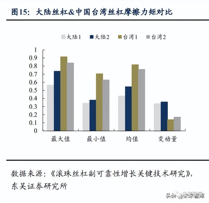 深究造成巨大差距的原因,主要在于产品的综合竞争力,而国产厂商的短板在于:1)产品初始性能差距:国产滚珠丝杠出厂时和外资相比就有性能差距。根据《滚珠 丝杠副可靠性增长关键技术研究》实验结果表明,针对同一批次的丝杠,大陆 样件的摩擦力矩的均值变化量在 20%以上,而中国台湾产品的不到 10%。而从行程误差 的分析来看,单个滚道中国台湾的丝杠性能也更加优异。究其原因,主要系大陆厂商的 预紧的操作不够规范,同时在施加完预紧力后,缺乏成熟的摩擦力矩快速检测方法,来 验证预紧力的施加是否合适,导致滚珠丝杠的综合性能产生差距。2)精度保持性差距:在使用初期,国产滚珠丝杠能够达到设计时要求的重复定位精度,但经过使用磨耗后滚珠丝杠组件中的背隙会逐渐变大,导致重复定位精度下降, 造成设备定位不准的问题。在上文同一试验中,大陆丝杠和中国台湾丝杠在试验过程中 均出现不同程度的性能退化,但相较之下大陆丝杠的精度保持性低于中国台湾丝杠。3)批量生产稳定性:国内企业实际上充分具备做出高精度丝杠的能力,但在大批 量加工时无法保证良品合格率。