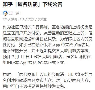 半个多月后的7月7日,知乎发布公告:“作为社区早期的产品机制,匿名功能的上线初衷是建立在用户开放讨论、友善互动的基础之上。但随着互联网沟通环境日益复杂,为保障社区内的良性讨论,取消匿名功能的新版本将在7月14日上线各大应用商店。”不过,知乎还是手下留情了,过往匿名帖可由发布者自行选择是否公开。