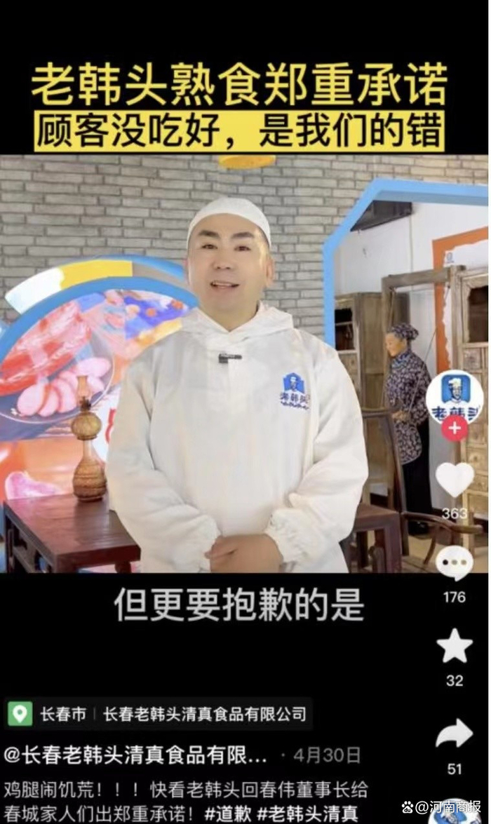 顶端新闻记者注意到,“老韩头”在2023年初的时候,还曾展望未来,表示未来五年将在全国开设1000家连锁店,2023年成为上市公司。2023年4月30日,“老韩头”的董事长回春伟还亲自录制视频,向网友表示“老韩头”推出的团购太过火爆,导致“顾客没吃好,是我们的错”,“感谢老百姓还记得我们这个在长春开了100多年的熟食品牌”。但最近两个月,“老韩头”食品已经在各大商超陆续撤柜。