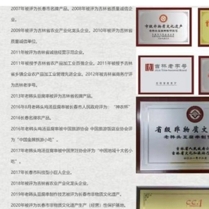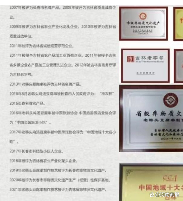 “老韩头”官网显示,“老韩头”先后被吉林省商务厅、中国旅游协会、中国烹饪协会等多个部门和协会评为“吉林老字号”长春市非物质文化遗产,老韩头鸡汤豆腐串被评为“中国地域十大名小吃”,2021年老韩头豆腐串制作技艺被评为吉林省非物质文化遗产。