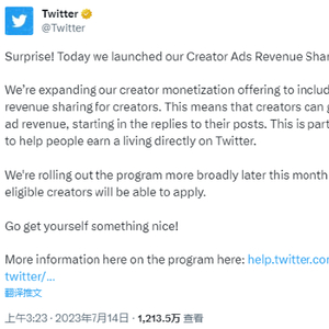 在推特上提供订阅服务的认证证券分析师Jake Wujastyk评价称,推特的新计划将使得这个平台对创作者更具吸引力,特别是在面对Threads的潜在竞争时,这将帮助更多人留在这个平台上。在推特上拥有22万粉丝的Jake透露,他在本周收到了2300美元的推特广告分成。