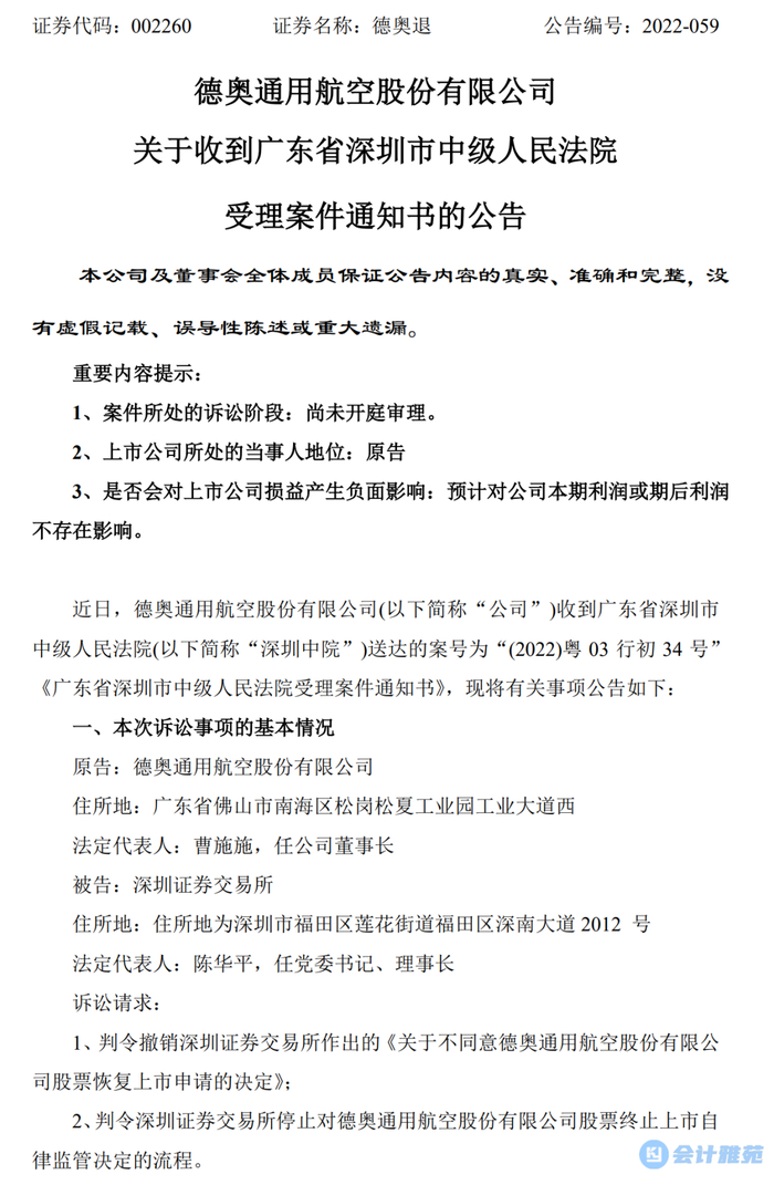 申请人向本所申请复核,申请撤销本所作出的《关于德奥通用航空股份有限公司股票终止上市的决定》(深证上〔2022〕399号)。其主要理由如下: