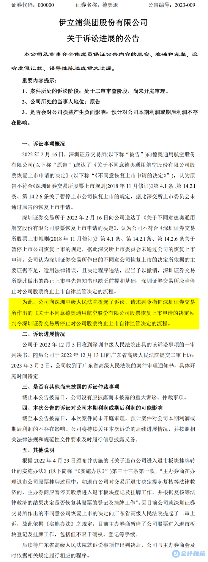 德奥退于2023年7月14日发布《关于诉讼进展的公告》,具体内容如下: