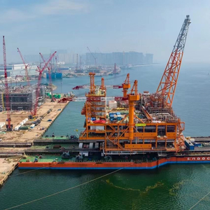 据悉,此次装船的中心处理平台高32米,长65米,宽56米,投影面积近9个标准篮球场大小;平台配备一座可以容纳120人同时工作的生活楼,是一座集生产、生活、生态功能为一体的8腿多功能综合海洋油气平台;平台总重量达12000余吨,相当于1万辆家用小汽车的重量,为一期项目最大组块。