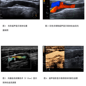 易损斑块的病理学特点:有薄的或破裂的纤维帽、富含脂质的坏死核心、斑块内出血或血栓、溃疡斑块、炎症细胞、斑块内新生血管形成是易损斑块最重要的特征。2017年欧洲医学和生物学超声协会联盟(EFSUMB)非肝脏超声造影指南中指出大量研究证实超声造影(CEUS)能够显示斑块内新生血管,并且与组织学病理结果具有高度相关性,它比常规超声具有更高的敏感性和准确性。超声造影作为一种快速便捷、不良反应极低的识别斑块稳定性的检查,越来越多地应用于临床中。很多研究表明超声造影显示斑块内新生血管与不稳定的形态学特征及病变严重程度高度相关,还能预测未来心脑血管事件的发生,因此能作为风险分层管理和临床决策制订的有用工具。超微血管成像技术(SMI)去除了杂波和运动伪影,保留了组织内的低速血流信号,能较敏感地检测到斑块内新生血管,有研究表明SMI与CEUS在显示斑块内新生血管部位方面有良好的一致性,而且无需使用造影剂,可以作为一种无创筛查和随访易损性斑块的方法。实时剪切波弹性成像(SWE),通过测量颈动脉斑块的杨氏模量值,根据杨氏模量值的大小评估斑块软硬度,以进一步评估斑块的易损性,可作为一种检测易损性斑块的成像方式。三维超声能够对斑块进行三维成像,较二维超声能更直观地显示斑块的位置、体积、表面形态,通过定量分析,得到斑块总面积、斑块体积、灰度中位值(GSM)等参数,提供了更多关于血管狭窄程度及斑块稳定性的信息。2020年美国超声心动图学会指南中推荐使用三维超声对颈动脉斑块体积进行量化,用于心血管风险分层。