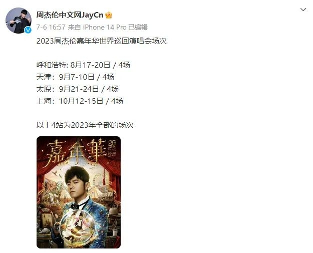 另一个好消息则是周杰伦嘉年华演唱会福州站审批通过。此前,周杰伦2023嘉年华世界巡回演唱会官方宣布今年接下来将有呼和浩特、天津、太原、上海场次。