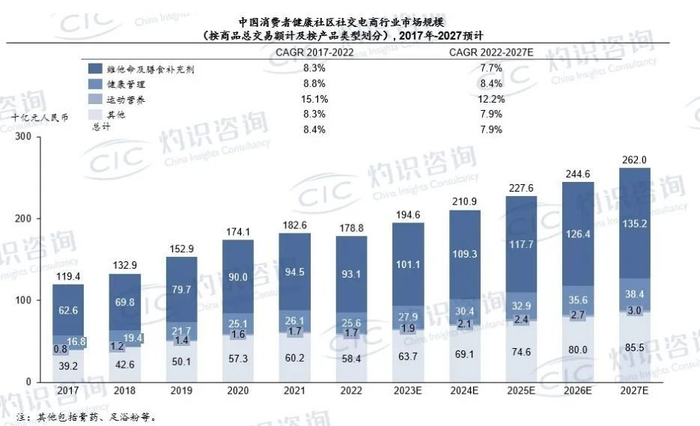 按产品类型划分,中国社交电商行业主要包括消费者健康、美容及个人护理,以及服装、食品及饮料等其他产品类别。在消费者健康细分市场,受益于轻量化生活趋势和忙碌的生活方式,以及日益增长的健康意识推动,健康管理产品发展迅速。按总商品交易额计,自2017年至2022年,健康管理社区社交电商行业的市场规模由人民币168亿元增至人民币256亿元,复合年增长率为8.8%,并预计将进一步增长,到2027年将达到人民币384亿元,2022年至2027年的复合年增长率为8.4%。