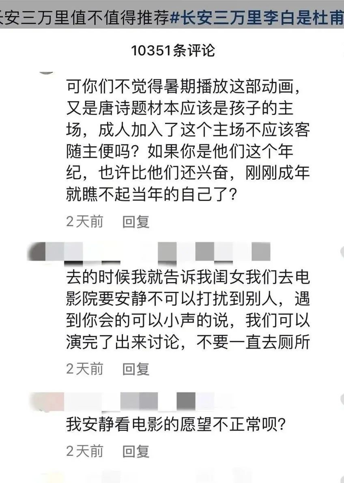而《长安三万里》的片方在接受媒体采访时表示,《长安三万里》想做的是覆盖到更多或许还没有动画观影习惯的“受众”,“好比说一些四五十岁的中年人,平时可能不会去看动画电影”。加之影片168分钟的时长,对于孩子来说,本身也存在一些让注意力集中的障碍。因此,网上也有部分声音认为,这并不是一部拍给小孩子看的电影,除了片中密集的文史知识点和绚丽的特效画面,诗词字面意思下所表达的深意,也需要“细品”才能感悟其中的伤感或通达。也正是因为其中许多段落需要“细品”,一些希望更沉浸式进入影片意境的成年观众,才会觉得现场孩子们的背诵成为了一种打扰。