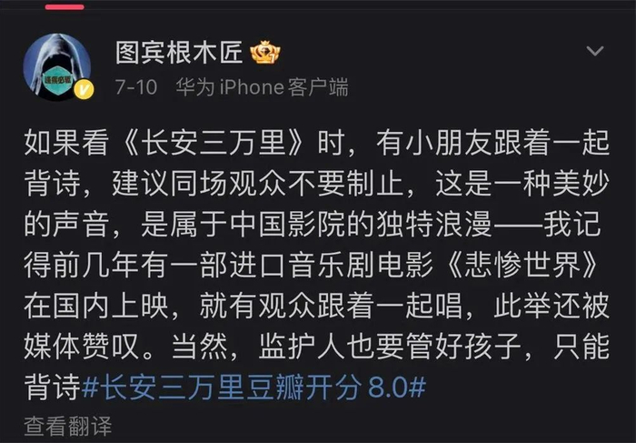 影片上映后,影评人@图宾根木匠 就发微博表示:“如果有小朋友跟着一起背诗,建议同场观众不要制止,这是一种美妙的声音,是属于中国影院的独特浪漫。”