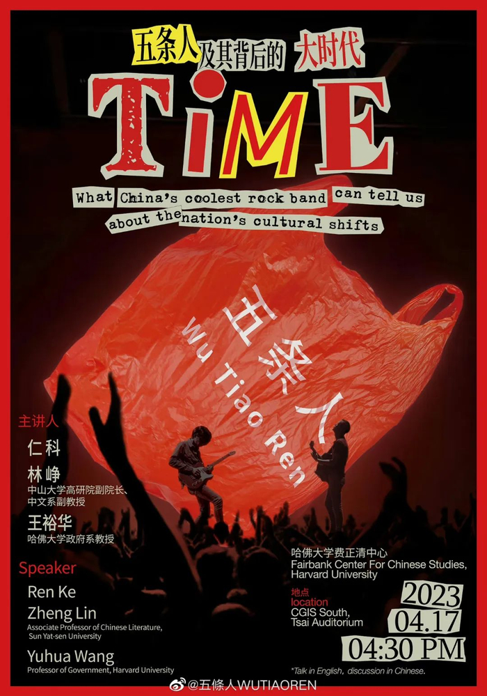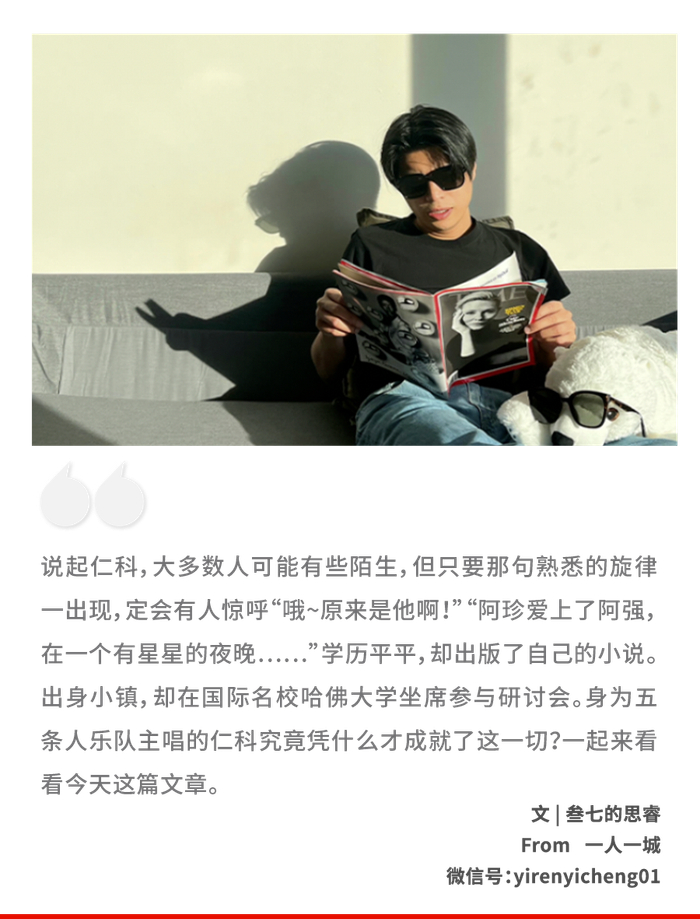 皮鞋牛仔裤黑西装,内搭一件白色T恤。此时,顶着长发背头正在哈佛大学座谈会上侃侃而谈的,是五条人乐队的主唱兼主音吉他、手风琴——仁科。