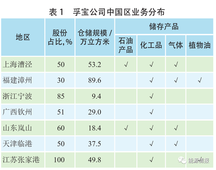 孚宝公司积极开拓中国业务,是20世纪80年代最早在中国从事第三方物流的外资企业,目前由成立于2004年的孚宝(上海)管理有限公司管理其在中国投资,现共有7个库区,总仓储规模约287万立方米,全部油库均可储存化工品,有4家油库可储存气体,有2家可储存石油产品,有2家可储存植物油,具体情况如表1所示。