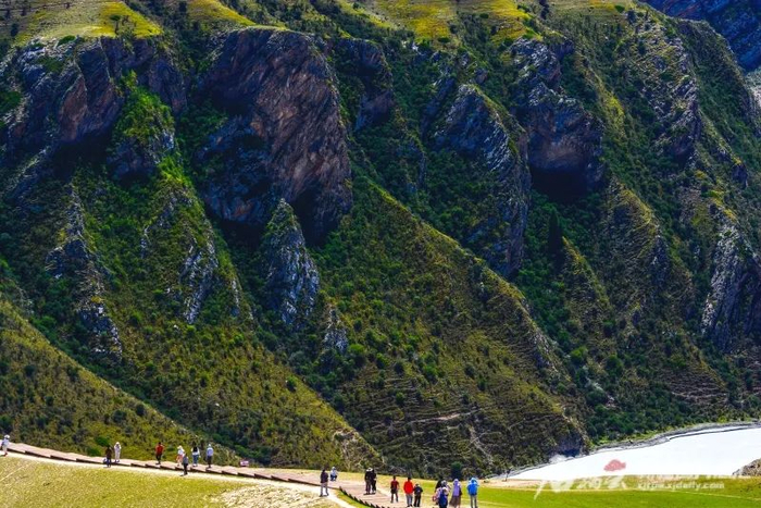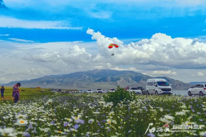 6月30日,游客在赛里木湖景区游玩。连日来,赛里木湖湖畔绿色的嫩草、湛蓝的湖水、粉红的花朵色彩斑斓,交相辉映,美景惹人醉,吸引众多游客来此打卡游玩。韩峻摄