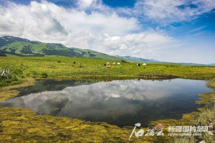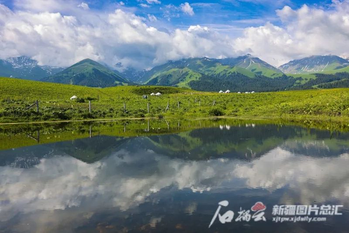 6月24日,那拉提空中草原蓝天、雪山、白云倒映在水中,青山白云环绕,在水中若隐若现,水天一色,组成了一幅和谐的画面,吸引不少摄影爱好者前来打卡。张文庭摄