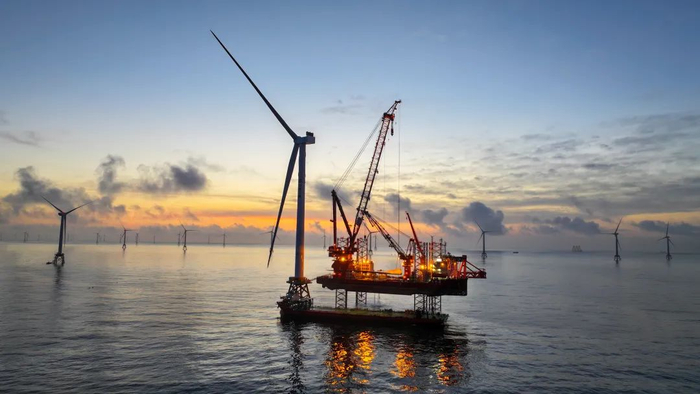 6月28日14时30分,位于福建省北部海域,由三峡集团与金风科技联合研发的首台16兆瓦海上风电机组成功吊装。