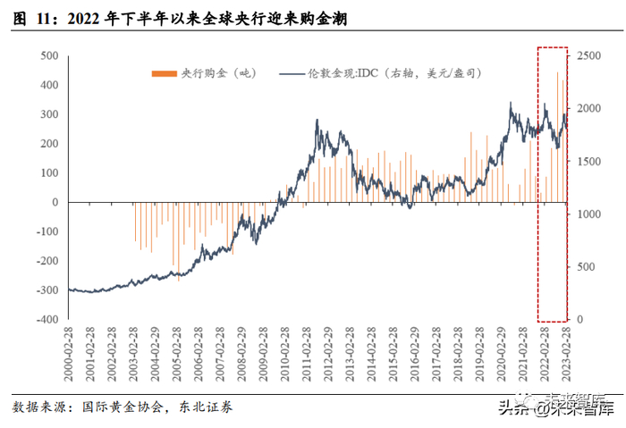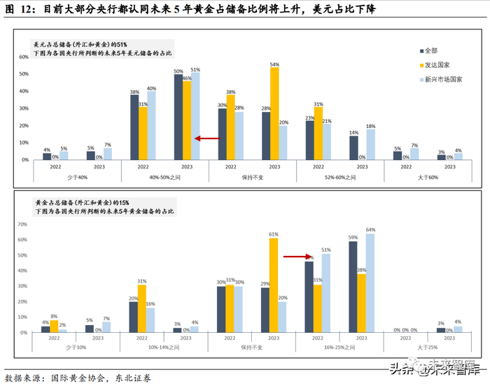 与美元储备配置减少相对应的,则是各国央行对于黄金的青睐。2022 年下半年以来 全球迎来央行购金潮,根据国际黄金协会数据,2022 年全球央行购金达 1078 吨, 为历史之最。中国央行也在 2023 年持续增持黄金,2023 年 1-5 月各月分别增持了30/30/15/25/18 吨黄金。目前大部分央行都认同黄金替换美元的逻辑,未来央行购金潮或得以延续。根据国 际黄金协会 2023 年 5 月发布的中央银行调查反馈结果,目前美元占总储备的 51%, 而大部分央行都认为未来会下降至 40%-50%,而黄金占总储备的 15%,大部分央行 都认为未来会上升至 16%-25%,且 2023 年这种判断较 2022 年进一步得到强化。